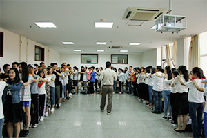 下午17点30分,所有参加岗前培训的新教师在8教315进行素质拓展热身。此次素质拓展训练依然是由青岛一修企业管理咨询有限公司资深培训师闫祥禄作为教练。闫教练先通过“爱的鼓励”“团队精神”等一系列热身活动,让新教师熟悉彼此,拉近距离。随后,所有参训教师分为六个队,分别选出各自的队长,设计队名、口号、队歌和对旗,增进大家对团队的认识和了解。最后,闫教练对27日的素质拓展训练进行了简要说明,让大家做好服装、防晒和心理上的准备。