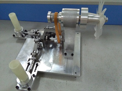 下图为实习成果之一:风力驱动送料机。此机器是由原动机、传动装置和工作装置组成。传动装置是用传递原动力的运动和动力、变换其运动形式以满足工作装置的需要,是机器的重要的组成部分。本设计中原动机为风力驱动,工作机为齿轮传动。传动过程中,风力驱动叶轮带动主轴传动,主轴转动带动同步带传动,通过锥齿轮转动带动曲柄滑块机构完成动作。