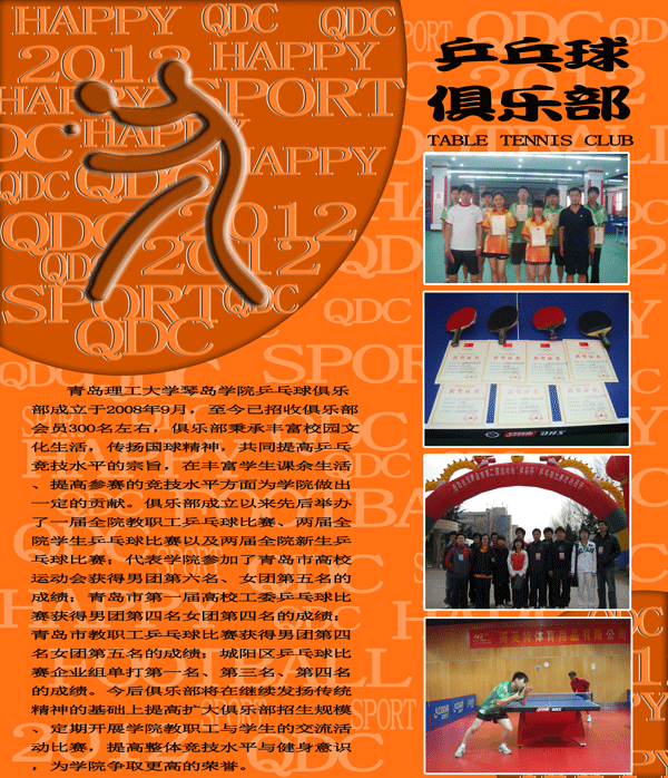 琴岛学院乒乓球俱乐部成立于2008年9月,自成立以来,俱乐部秉承着丰富广大师生课余生活,推广普及国球运动,为琴岛学院乒乓爱好者提供稳定融洽的交流、学习、共同进步平台的宗旨,先后招收学员100余名,并选拔组建了琴岛学院乒乓球队,代表学院参加青岛市各级比赛。