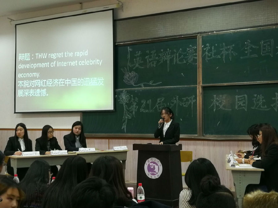 比赛正式开始,选手严格根据英国议会制辩论规则依次发言履行职能,在有限的时间内,语言流利,观点明晰,逻辑完整。辩手们旁征博引,妙语连珠,引用papi酱、张大奕等网红人物的事例来论证自己的观点。过程中理论与实践齐飞,观点与事例并具。不时,场上的选手与队友耳语几句,通过合作让论证更为严丝合缝。在辩论中,双方更是针锋相对,抓住突破口进行绝地反驳,或一针见血、或循循善诱,赛场上气氛紧张激烈,双方对手你来我往,侃侃而谈;场下观众反应热烈,掌声连连响起。