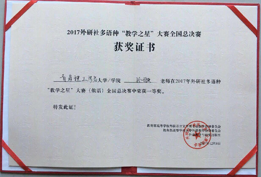 - 孙璇老师荣获2017外研社多语种“教学之星”全国总决赛一等奖[2017-12-14]