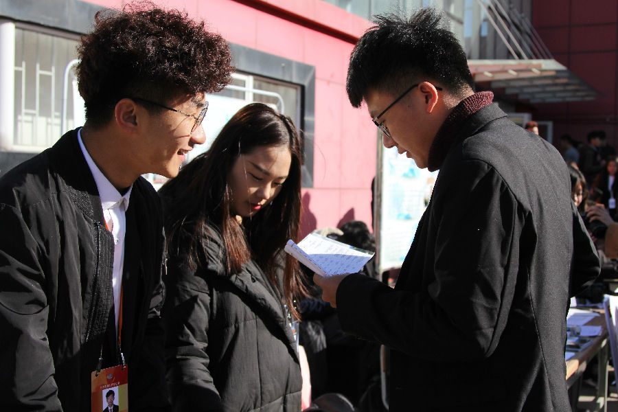 参会毕业生在辅导员老师的组织下早早来到会场,此次校园招聘会约有300多家企业前来招聘,2018届的毕业生都积极应聘。今年的毕业生关注自身发展、企业发展前景、福利待遇的意识明显增强。招聘会上参会单位积极宣传,从高出往年的薪资待遇、未来发展、企业文化建设等方面吸引学生眼球,并且大部分单位愿意接受毕业生实习。会场气氛热烈,同学们纷纷投出自己的简历,招聘代表与毕业生积极交流,部分同学被招聘单位当场录用。艺术系副主任胡强老师、矫恒盛老师更是在现场鼓励同学们多了解几家参会单位,多投出几份简历,争取在这次招聘会上找到适合自己的岗位。