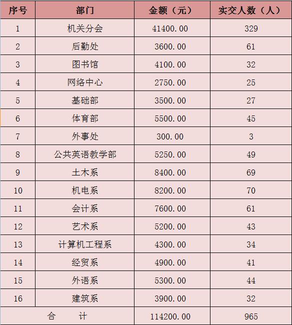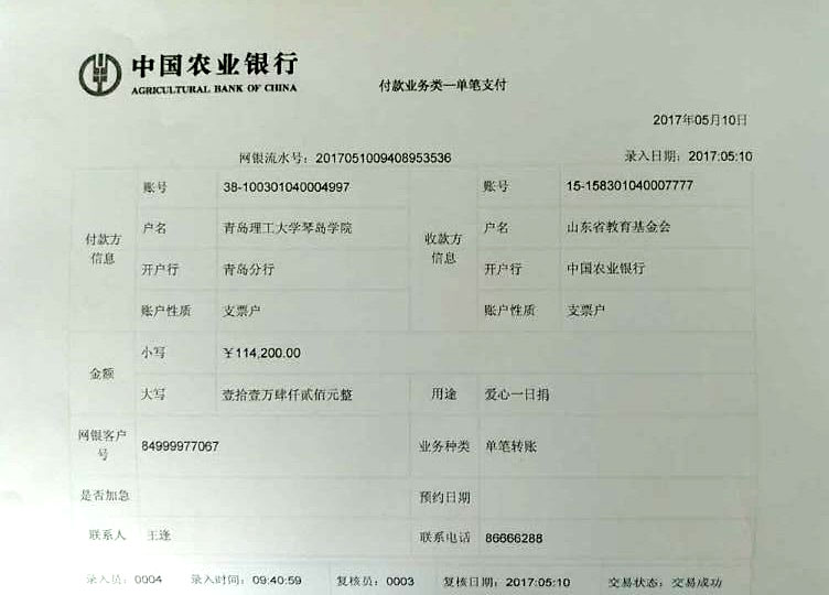 近日,根据《山东省教育基金会等3部门关于开展2017年“爱心一日捐”活动的通知》(鲁教基金字〔2017〕5号)的文件精神,学院在全院教职工中组织开展了“爱心一日捐”活动。在院工会的号召下,学院领导班子带头,各系各部门包括家庭本身并不富裕的教职工纷纷献出自己的爱心,共计965人参与到了本次“一日捐”活动,捐赠善款114200元。本次所有捐款统一汇入山东省教育基金会账户,将用于资助家庭经济困难的师生。