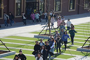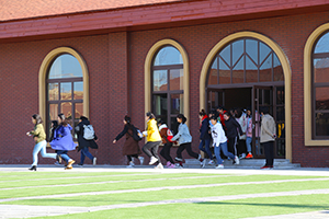 在外语系教师的指挥下,学生们听到预先警报后,迅速而有序地从东西两侧教室撤离,分为三队从九教的北门和东门跑步离开教学楼,全体师生在三分钟内迅速撤离教学楼。随后,在教学楼外,学生们屏息辨听警报声,学习分辨警报类型。在解除警报响起后,学生有序从楼外跑进,动作迅速。上午十点二十分,防空防灾警报试鸣演习圆满结束。